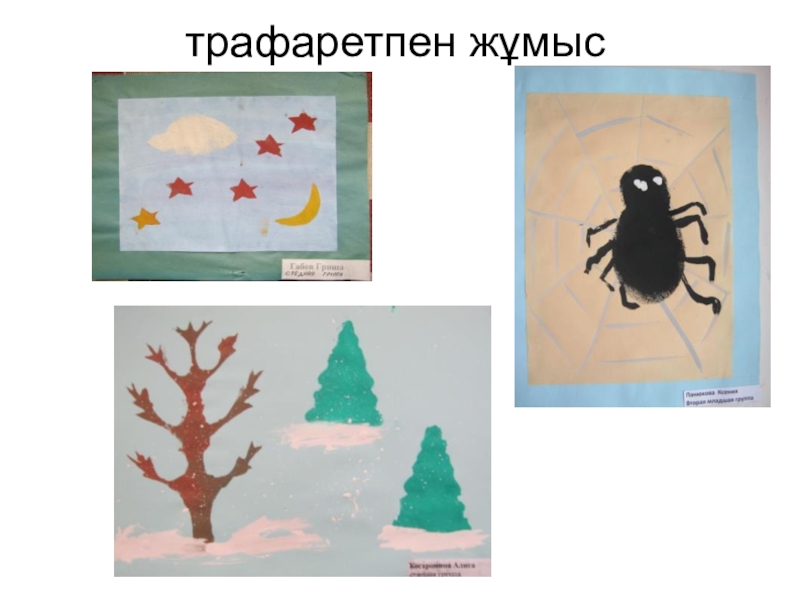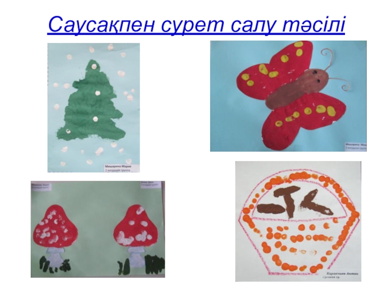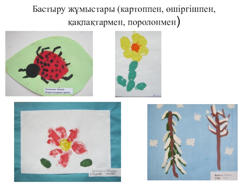 Слайд 12Бастыру жұмыстары (картоппен, өшіргішпен, қақпақтармен, поролонмен)
