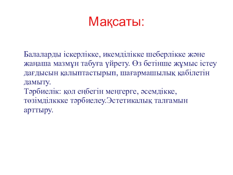 Балаларды іскерлікке, икемділікке шеберлікке және жаңаша мазмұн табуға үйрету. Өз бетінше