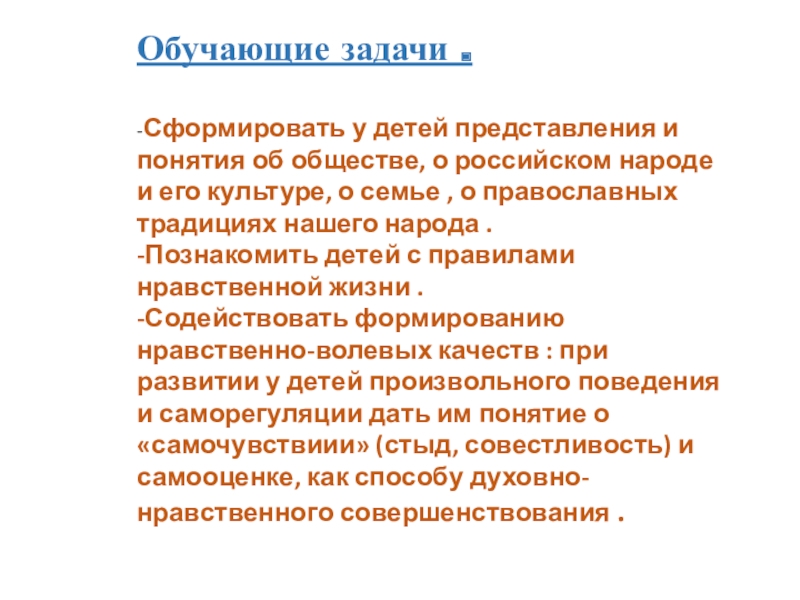-Содействовать формированию нравственно-волевых качеств : при развитии у детей произвольного поведения и саморегуляции дать им понятие о «самочувствиии» (стыд, совестливость) и самооценке, как способу духовно-нравственного совершенствования .