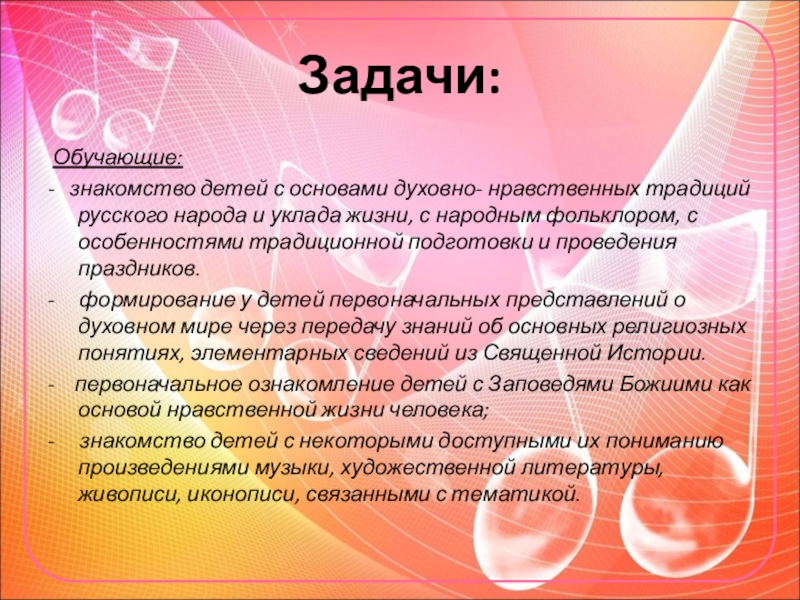 - формирование у детей первоначальных представлений о духовном мире через передачу знаний об основных религиозных понятиях, элементарных сведений из Священной Истории.