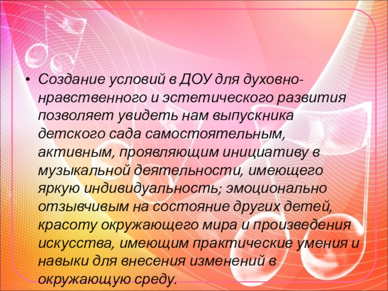 нам выпускника детского сада самостоятельным, активным, проявляющим инициативу в музыкальной деятельности, имеющего яркую индивидуальность; эмоционально отзывчивым на состояние других детей, красоту окружающего мира и произведения искусства, имеющим практические умения и навыки для внесения изменений в окружающую среду.