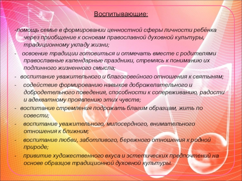 - привитие художественного вкуса и эстетических предпочтений на основе образцов традиционной духовной культуры.