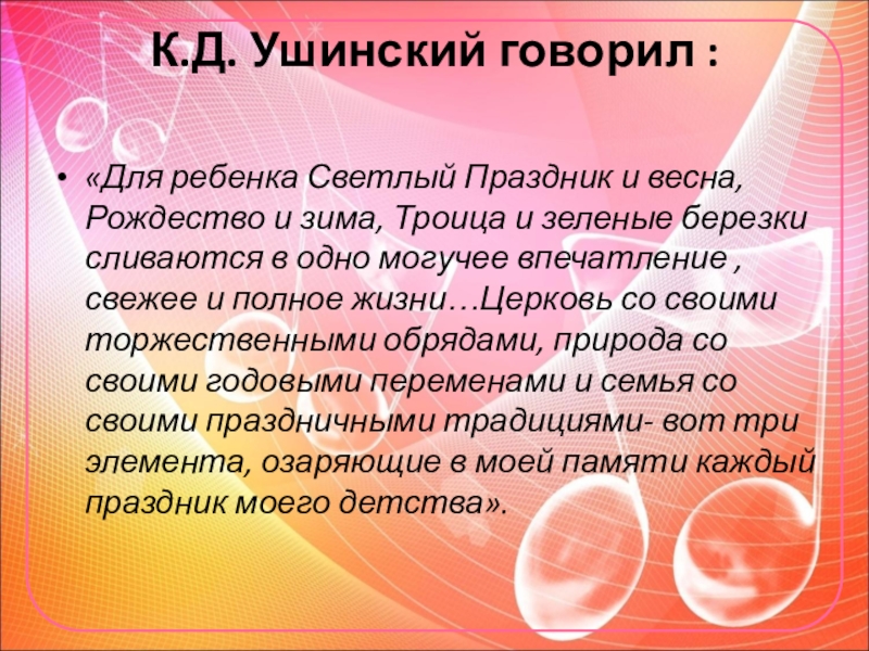 зима, Троица и зеленые березки сливаются в одно могучее впечатление , свежее и полное жизни…Церковь со своими торжественными обрядами, природа со своими годовыми переменами и семья со своими праздничными традициями- вот три элемента, озаряющие в моей памяти каждый праздник моего детства».