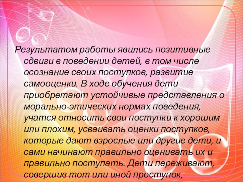 Результатом работы явились позитивные сдвиги в поведении детей, в том числе