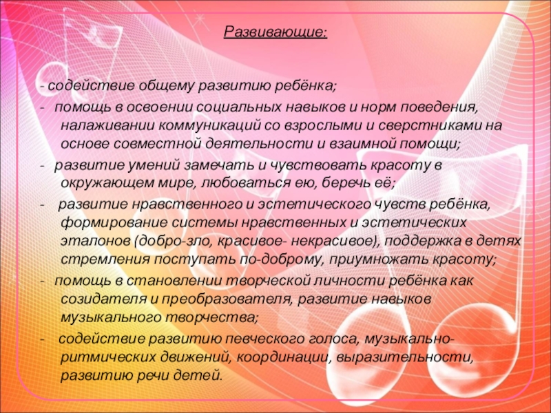 - содействие развитию певческого голоса, музыкально- ритмических движений, координации, выразительности, развитию речи детей.