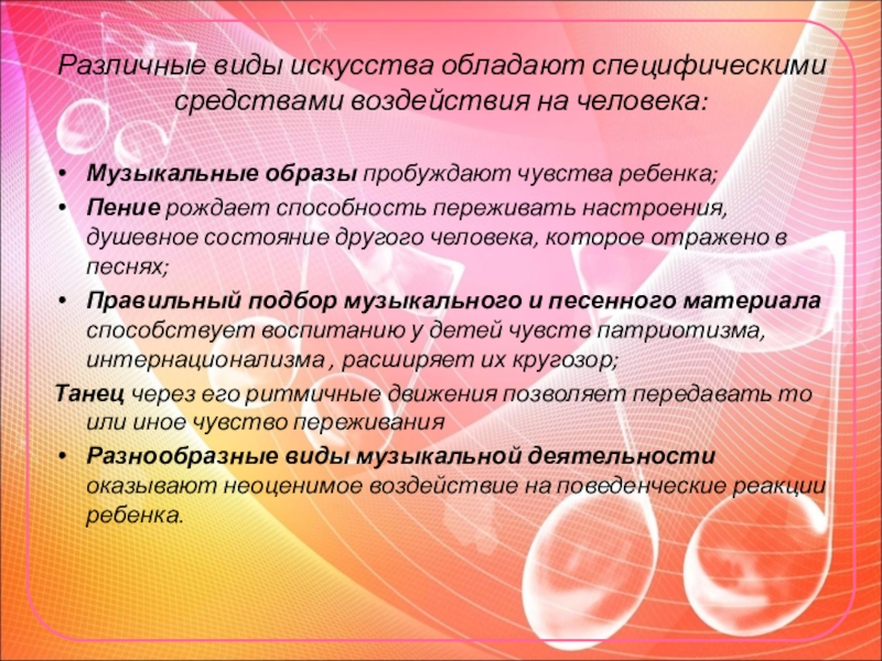 Слайд 8Различные виды искусства обладают специфическими средствами воздействия на человека: