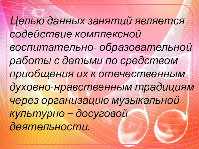 образовательной работы с детьми по средством приобщения их к отечественным духовно-нравственным традициям через организацию музыкальной культурно – досуговой деятельности.