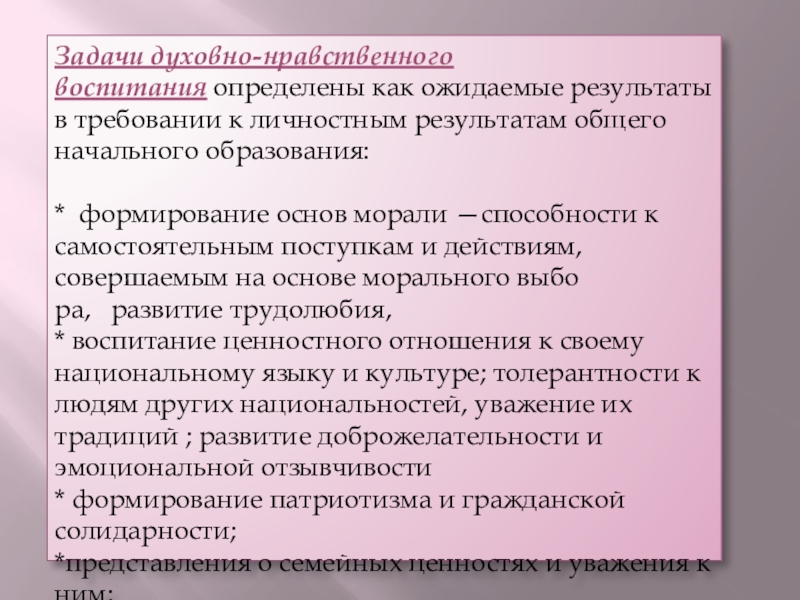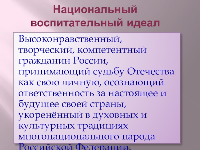 « Современный национальный идеал личности – высоконравственный, творческий, компетентный гражданин России, принимающий судьбу Отечества как свою личную, осознающий ответственность за настоящее и будущее своей страны, укорененный в духовных и культурных традициях многонационального народа Российской Федерации».