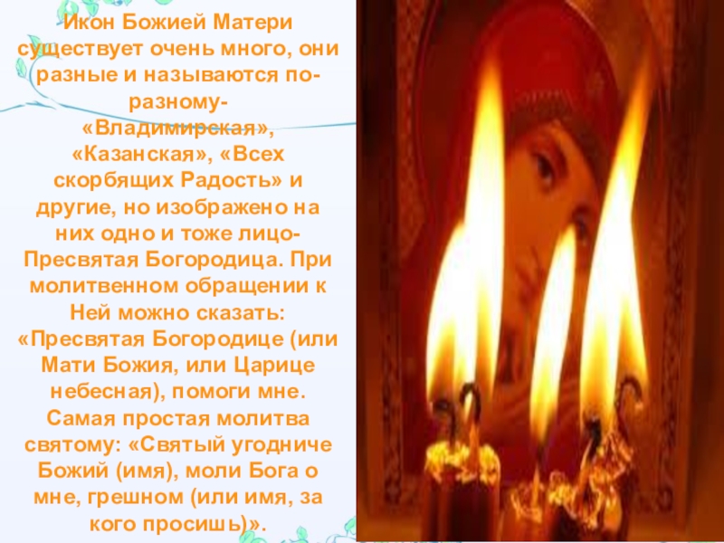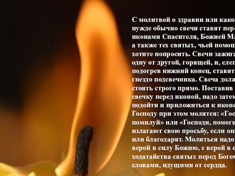 С молитвой о здравии или какой-либо нужде обычно свечи ставят перед иконами Спасителя, Божией Матери, а также тех святых, чьей помощи вы хотите попросить. Свечи зажигают одну от другой, горящей, и, слегка подогрев нижний конец, ставят в гнездо подсвечника. Свеча должна стоять строго прямо. Поставив свечку перед иконой, надо затем подойти и приложиться к иконе. Господу при этом молятся: «Господи, помилуй» или «Господи, помоги» - и излагают свою просьбу, если она есть, или благодарят. Молиться надо с верой в силу Божию, с верой в силу ходатайства святых перед Богом, со словами, идущими от сердца.