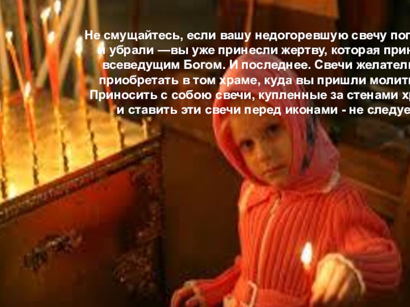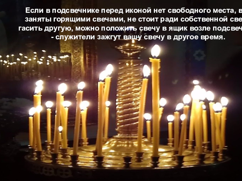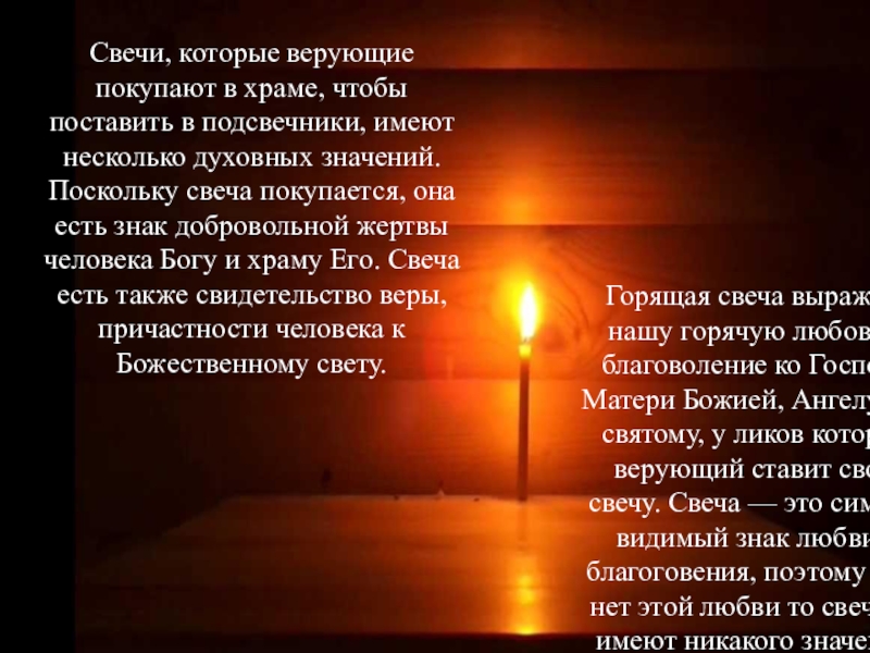 Горящая свеча выражает нашу горячую любовь и благоволение ко Господу, Матери Божией, Ангелу или святому, у ликов которых верующий ставит свою свечу. Свеча — это символ, видимый знак любви и благоговения, поэтому если нет этой любви то свечи не имеют никакого значения, жертва наша напрасна.
