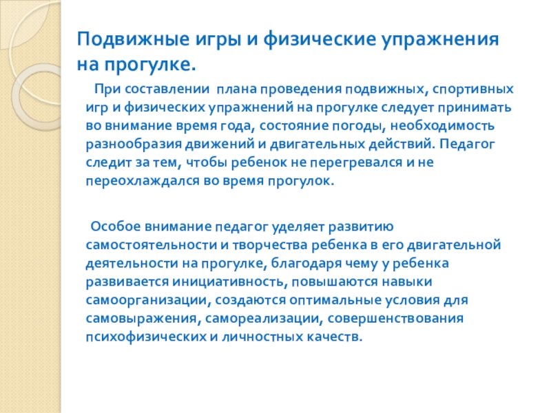 составлении плана проведения подвижных, спортивных игр и физических упражнений на прогулке следует принимать во внимание время года, состояние погоды, необходимость разнообразия движений и двигательных действий. Педагог следит за тем, чтобы ребенок не перегревался и не переохлаждался во время прогулок.