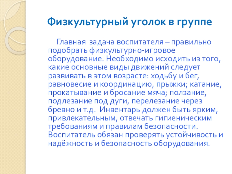 – правильно подобрать физкультурно-игровое оборудование. Необходимо исходить из того, какие основные виды движений следует развивать в этом возрасте: ходьбу и бег, равновесие и координацию, прыжки; катание, прокатывание и бросание мяча; ползание, подлезание под дуги, перелезание через бревно и т.д. Инвентарь должен быть ярким, привлекательным, отвечать гигиеническим требованиям и правилам безопасности. Воспитатель обязан проверять устойчивость и надёжность и безопасность оборудования.