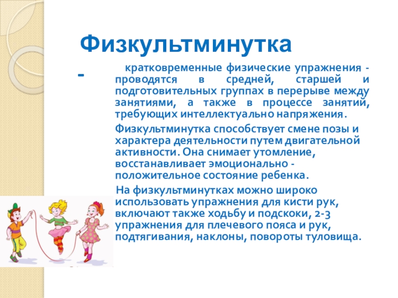 Слайд 8 кратковременные физические упражнения - проводятся в средней, старшей