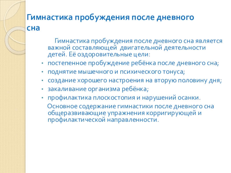после дневного сна является важной составляющей двигательной деятельности детей. Её оздоровительные цели: