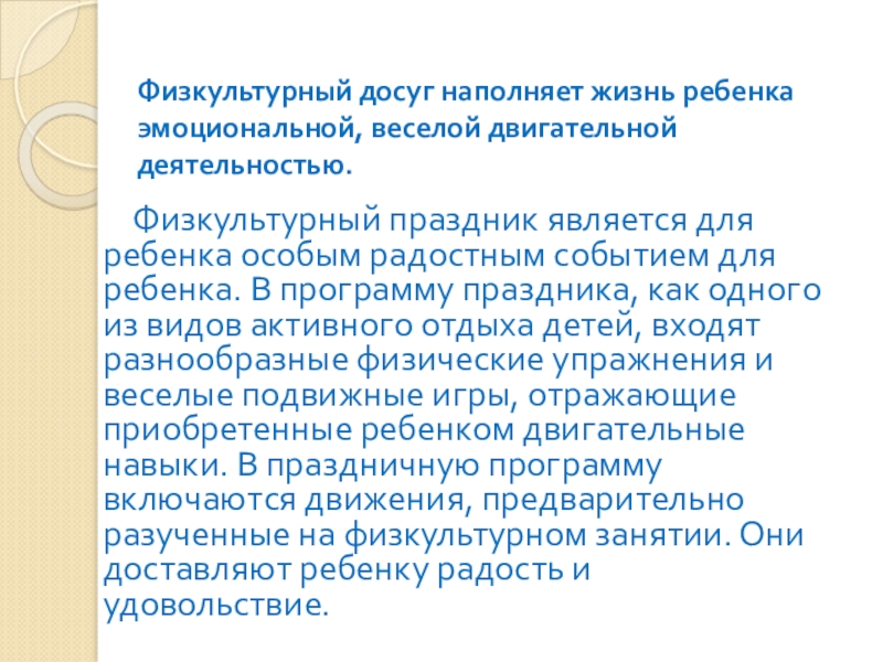 Слайд 20Физкультурный досуг наполняет жизнь ребенка эмоциональной, веселой двигательной деятельностью.