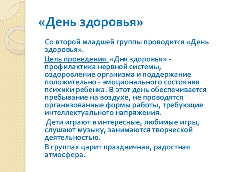 Цель проведения «Дня здоровья» - профилактика нервной системы, оздоровление организма и поддержание положительно - эмоционального состояния психики ребенка. В этот день обеспечивается пребывание на воздухе, не проводятся организованные формы работы, требующие интеллектуального напряжения.