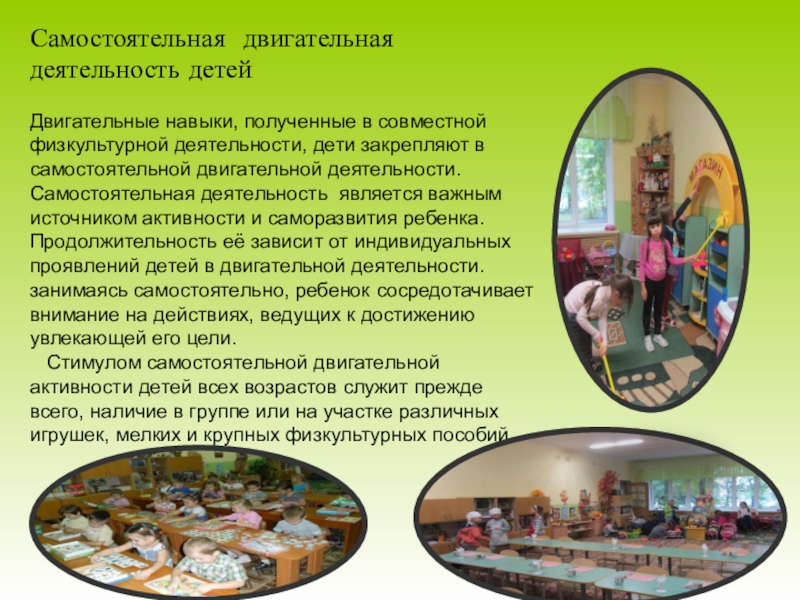 закрепляют в самостоятельной двигательной деятельности. Самостоятельная деятельность является важным источником активности и саморазвития ребенка. Продолжительность её зависит от индивидуальных проявлений детей в двигательной деятельности. занимаясь самостоятельно, ребенок сосредотачивает внимание на действиях, ведущих к достижению увлекающей его цели.