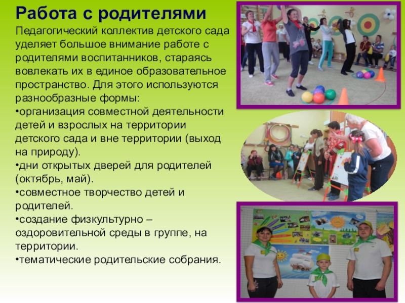родителями воспитанников, стараясь вовлекать их в единое образовательное пространство. Для этого используются разнообразные формы: