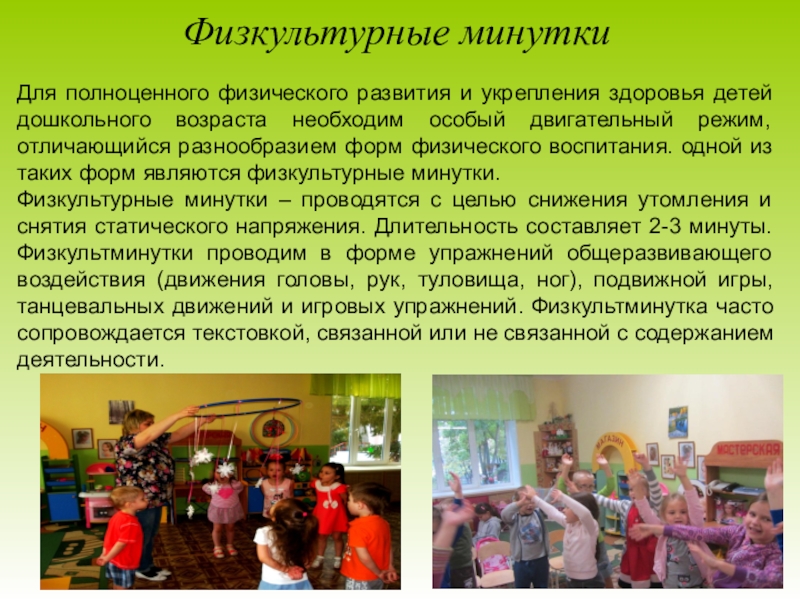 необходим особый двигательный режим, отличающийся разнообразием форм физического воспитания. одной из таких форм являются физкультурные минутки.