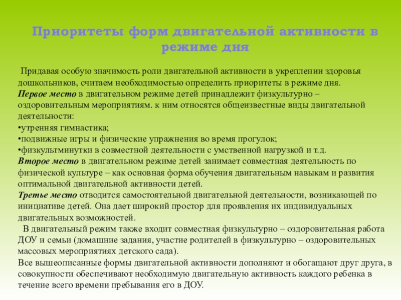 Слайд 7Приоритеты форм двигательной активности в режиме дня