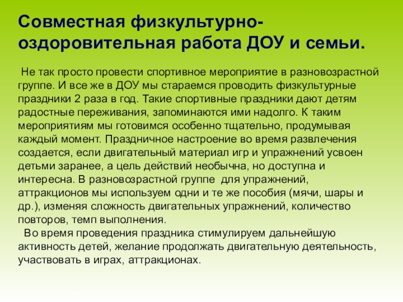 мероприятие в разновозрастной группе. И все же в ДОУ мы стараемся проводить физкультурные праздники 2 раза в год. Такие спортивные праздники дают детям радостные переживания, запоминаются ими надолго. К таким мероприятиям мы готовимся особенно тщательно, продумывая каждый момент. Праздничное настроение во время развлечения создается, если двигательный материал игр и упражнений усвоен детьми заранее, а цель действий необычна, но доступна и интересна. В разновозрастной группе для упражнений, аттракционов мы используем одни и те же пособия (мячи, шары и др.), изменяя сложность двигательных упражнений, количество повторов, темп выполнения.