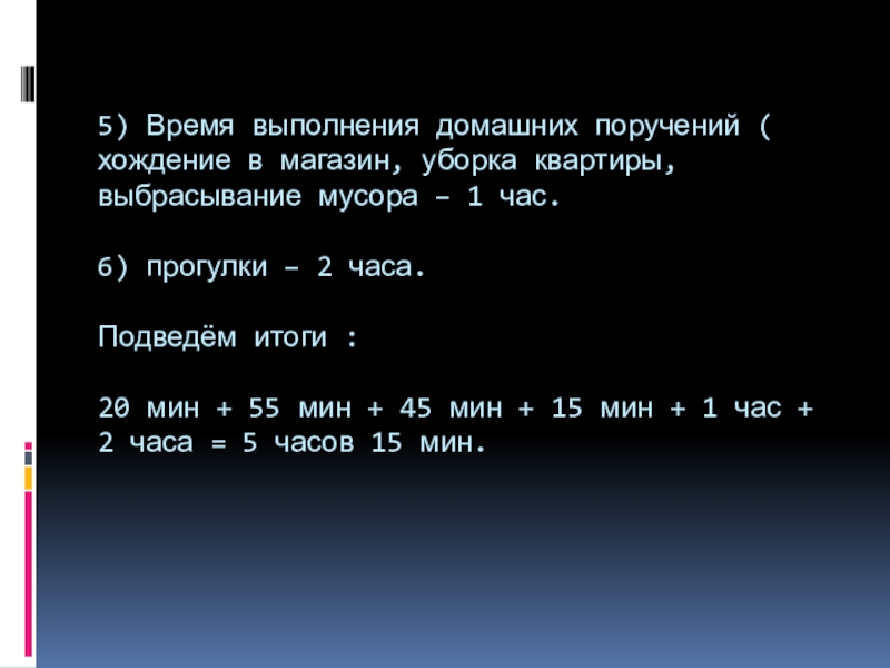 Слайд 105) Время выполнения домашних поручений ( хождение в магазин, уборка квартиры,
