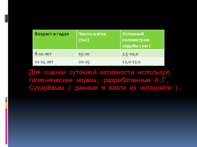 Слайд 12Для оценки суточной активности использую гигиенические нормы, разработанные А.Г. Сухарёвым (