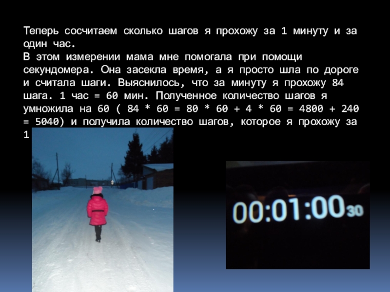 В этом измерении мама мне помогала при помощи секундомера. Она засекла время, а я просто шла по дороге и считала шаги. Выяснилось, что за минуту я прохожу 84 шага. 1 час = 60 мин. Полученное количество шагов я умножила на 60 ( 84 * 60 = 80 * 60 + 4 * 60 = 4800 + 240 = 5040) и получила количество шагов, которое я прохожу за 1 час – 5040 шагов.