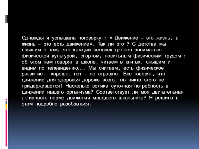 жизнь – это есть движение». Так ли это ? С детства мы слышим о том, что каждый человек должен заниматься физической культурой, спортом, посильным физическим трудом : об этом нам говорят в школе, читаем в книгах, слышим и видим по телевидению…. Мы считаем, есть физическое развитие – хорошо, нет – не страшно. Все говорят, что движение для здоровья дороже всего, но никто этого не придерживается! Насколько велика суточная потребность в движении нашего организма? Соответствует ли моя двигательная активность норме движения младшего школьника? Я решила в этом подробно разобраться.
