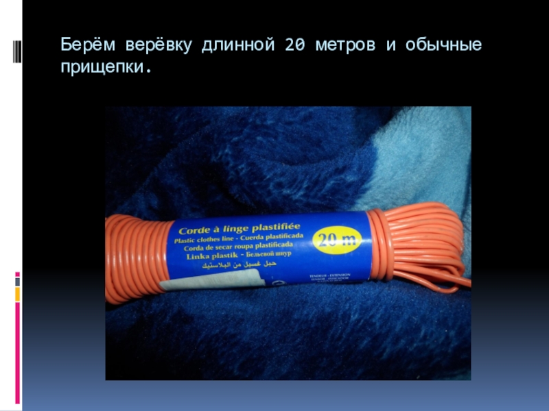 Слайд 5Берём верёвку длинной 20 метров и обычные прищепки.
