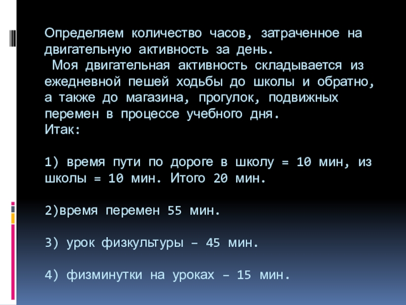 Слайд 9Определяем количество часов, затраченное на двигательную активность за день.