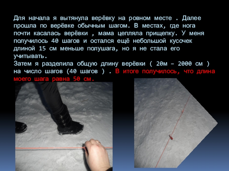 Затем я разделила общую длину верёвки ( 20м – 2000 см ) на число шагов (40 шагов ) . В итоге получилось, что длина моего шага равна 50 см.