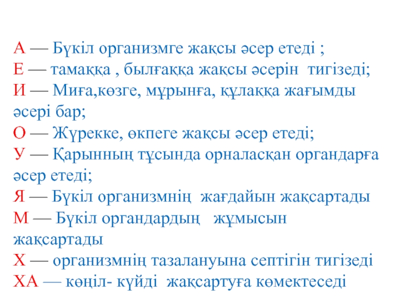 А — Бүкіл организмге жақсы әсер етеді ;Е — тамаққа , былғаққа жақсы әсерін тигізеді;И — Миға,көзге, мұрынға, құлаққа жағымды әсері бар;О — Жүрекке, өкпеге жақсы әсер етеді;У — Қарынның тұсында орналасқан органдарға әсер етеді;Я —