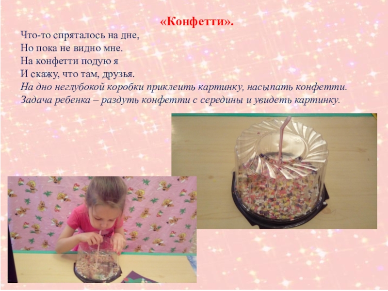 «Конфетти».Что-то спряталось на дне,     Но пока не видно мне.  На конфетти подую я       И скажу, что