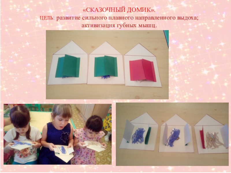 «Сказочный домик».Цель: развитие сильного плавного направленного выдоха; активизация губных мышц.