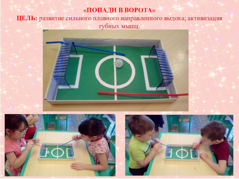 «Попади в ворота»Цель: развитие сильного плавного направленного выдоха; активизация губных мышц.