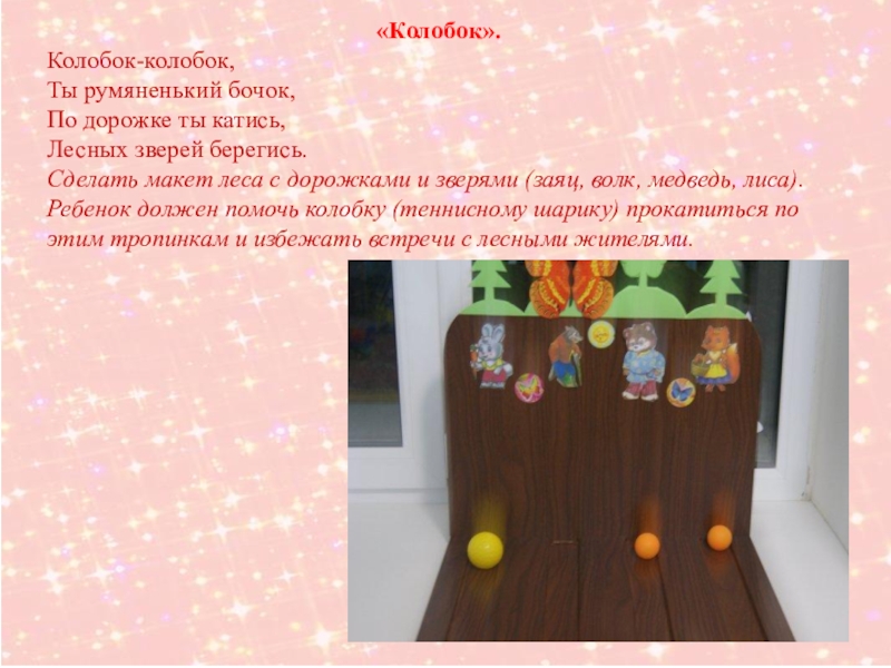 «Колобок».Колобок-колобок, Ты румяненький бочок,         По дорожке ты катись,          Лесных зверей берегись.Сделать макет леса с дорожками и зверями