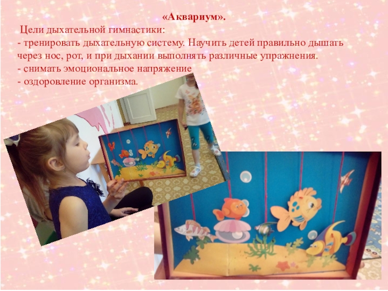 «Аквариум». Цели дыхательной гимнастики:- тренировать дыхательную систему. Научить детей правильно дышать через нос, рот, и при дыхании выполнять