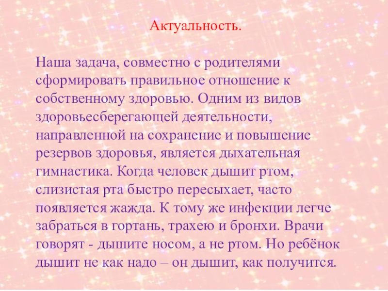 здоровью. Одним из видов здоровьесберегающей деятельности, направленной на сохранение и повышение резервов здоровья, является дыхательная гимнастика. Когда человек дышит ртом, слизистая рта быстро пересыхает, часто появляется жажда. К тому же инфекции легче забраться в гортань, трахею и бронхи. Врачи говорят - дышите носом, а не ртом. Но ребёнок дышит не как надо – он дышит, как получится.