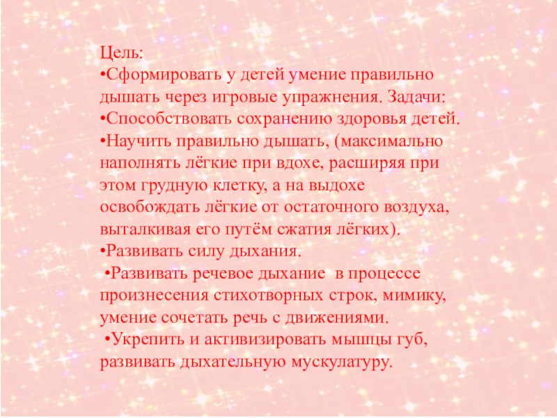 Цель: •Сформировать у детей умение правильно дышать через игровые упражнения. Задачи: •Способствовать сохранению здоровья детей. •Научить правильно