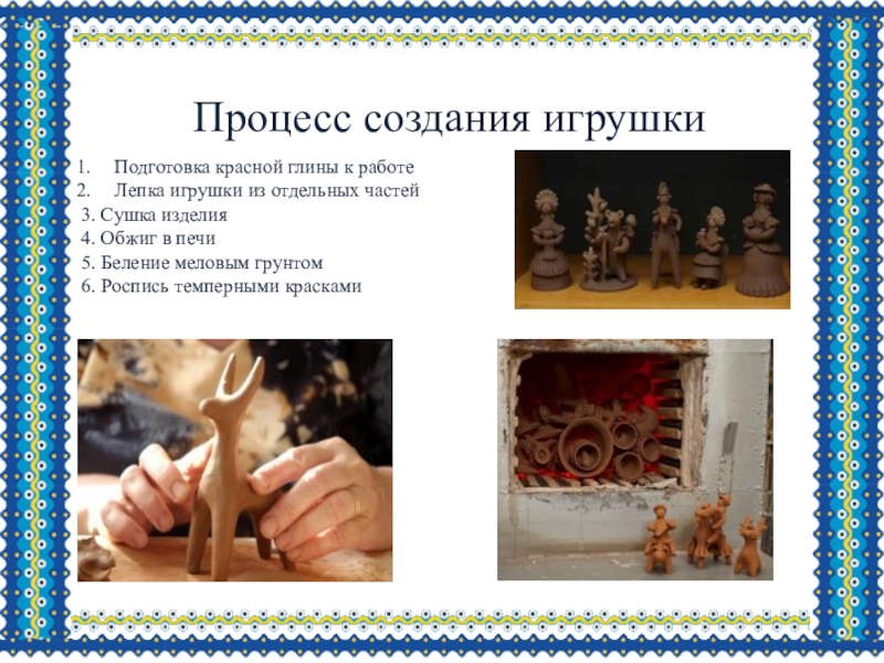 Процесс создания игрушкиПодготовка красной глины к работеЛепка игрушки из отдельных частей3. Сушка изделия4. Обжиг в печи5. Беление