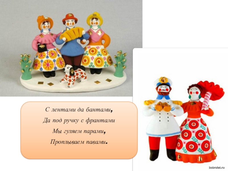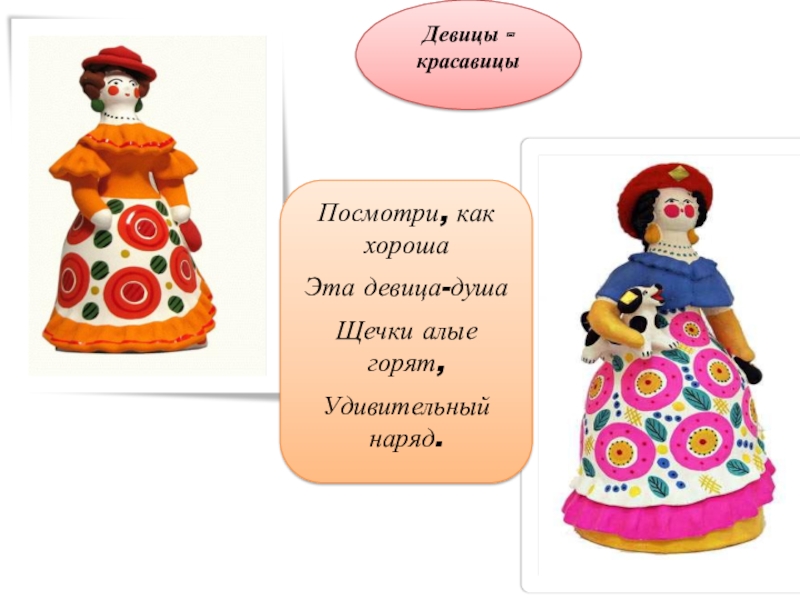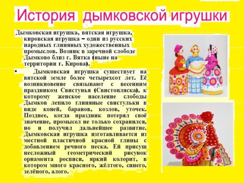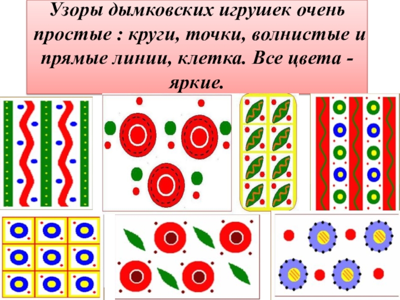 Узоры дымковских игрушек очень простые : круги, точки, волнистые и прямые