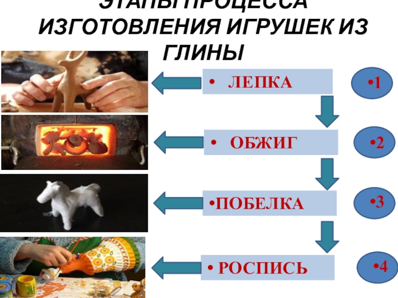 Слайд 5ЭТАПЫ ПРОЦЕССА ИЗГОТОВЛЕНИЯ ИГРУШЕК ИЗ ГЛИНЫ
