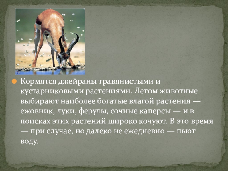Слайд 5Кормятся джейраны травянистыми и кустарниковыми растениями. Летом животные выбирают наиболее богатые