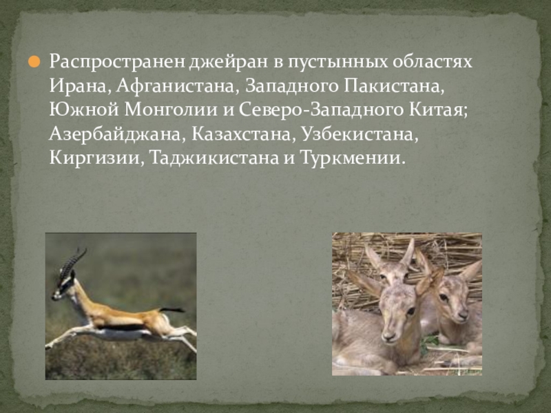 Слайд 4Распространен джейран в пустынных областях Ирана, Афганистана, Западного Пакистана, Южной Монголии