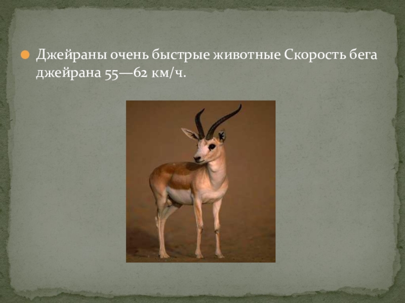 Слайд 6Джейраны очень быстрые животные Скорость бега джейрана 55—62 км/ч.
