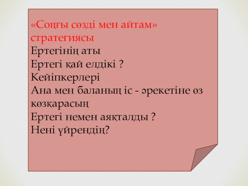 «Соңғы сөзді мен айтам» стратегиясыЕртегінің атыЕртегі қай елдікі ?КейіпкерлеріАна мен баланың іс - әрекетіне өз көзқарасыңЕртегі немен
