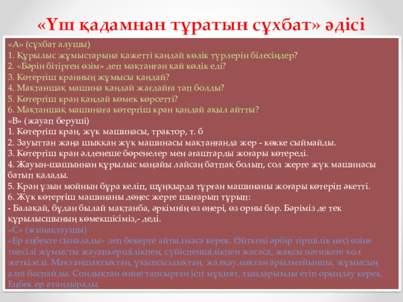 «Үш қадамнан тұратын сұхбат» әдісі «А» (сұхбат алушы)1. Құрылыс жұмыстарына қажетті қандай көлік түрлерін білесіңдер?2. «Бәрін бітірген