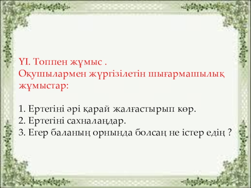 ҮІ. Топпен жұмыс .Оқушылармен жүргізілетін шығармашылық жұмыстар: 1. Ертегіні әрі қарай жалғастырып көр.2. Ертегіні сахналаңдар.3. Егер баланың орнында
