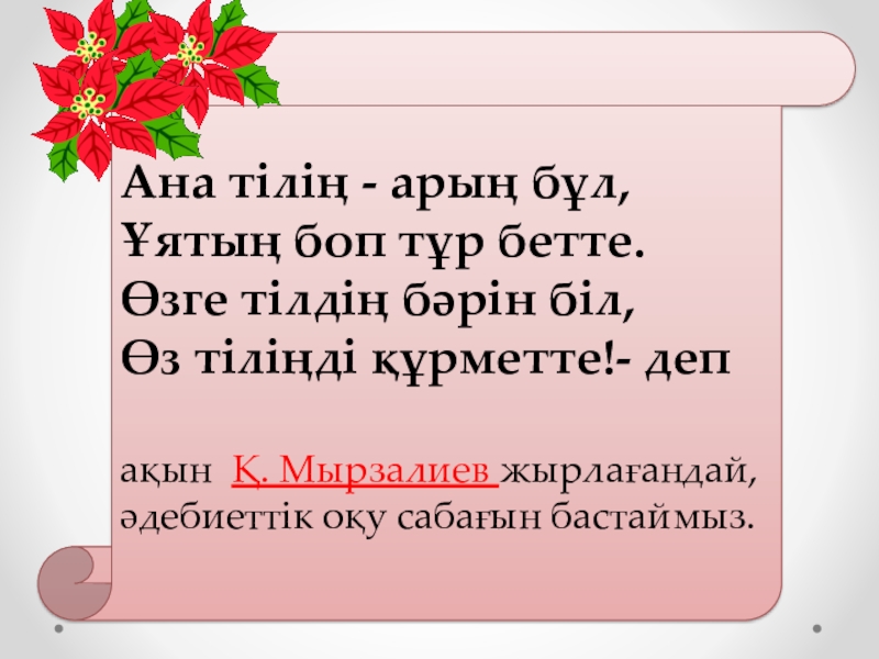 ақын Қ. Мырзалиев жырлағандай, әдебиеттік оқу сабағын бастаймыз.